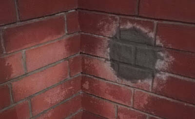 Jøtulovnen hadde ett røkrør som var 15cm langt, og gikk fra ovnens bakside og rett inn i pipa. Jeg måtte da først tette dette hullet med ildfast mørtel, før jeg senere skal lage ett nytt hull i pipa mye høyere opp. Da jeg murte igjen hullet i pipa, forsøkte jeg etter fattig evne å immitere mursteinsmønster i mørtelen, hehe... Ikke så veldig vellykket kanskje, men jeg trøster meg med at hullet hadde vært enda mer synlig om jeg ikke hadde gjort det...