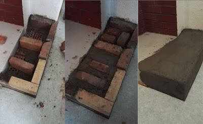 For å slippe å bruke 100 kg med betong, og måtte lage forskaling, så valgte jeg å bruke noen gamle teglsteiner jeg fant i uthuset, som "grunnmur". Så var det bare å fylle på med betong, oppi og på sidene. Jeg fuktet mursteinene litt før jeg smørte betongen på kantene med en murerskje. Så glattet jeg alt ut. Dekket med plast, og så var det bare å vente på at det skulle tørke...
