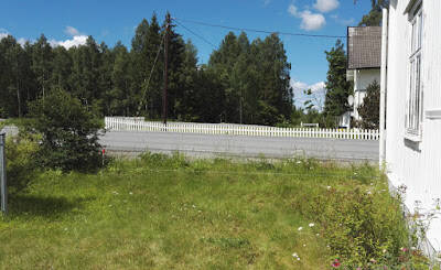Så nå begynner jeg med den delen av hagen som ligger nesten ut i vegen. Her er det gode solforhold, og drivhuset skal opp her etterhvert, men det er ikke noe trivelig å slå seg ned her, da man sitter rett ut i trafikken... nesten. Ett gjerde her vil også dempe noe av vinden håper jeg, da det blåser ganske stritt gjennom dalen her...