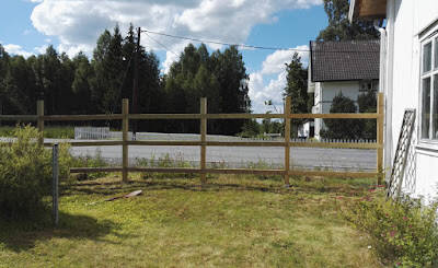 Endelig skal hagen få en etterlengtet avskjerming mot vegen. Planen er jo å gjerde inn hele sulamitten, men må nødvendigvis begynne et sted. Dessuten er det ett penge-spørsmål, hehehe. Gjerde på 150m er ikke gratis kan du si...