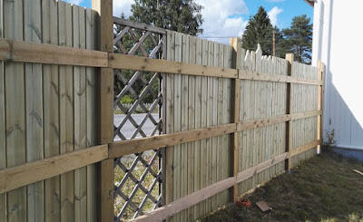 For å "bryte" litt i den massive veggen, så satte jeg inn ett felt med espalier jeg hadde liggende. Kanskje kan en klematis finne plassen sin her? Jeg sagde også noen av bordene i spiss, og i forskjellige lengder, for å lage en illusjon av fuglehus. Borret så ut hull, og limte på vindskier... Man får ikke mer morro enn man lager selv er ett godt motto :) Da virker kanskje ikke gjerdet så avvisende..