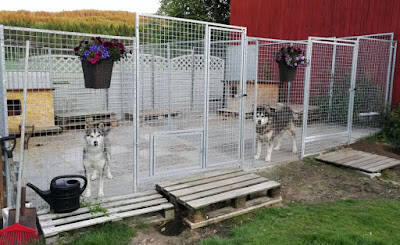 Satt å så på de triste hundehusene som er laget av osb-plater, og tenkte at de definitivt trengte et strøk maling...