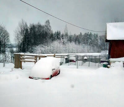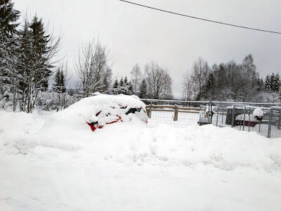 Var ute kl 0600 i dag, og forsøkte etter beste evne å måke litt, men det var bare å gi opp... Det har begynt å regne, og på toppen av de 30cm med snø ble det litt i overkant av hva denne kroppen klarer. Det var bare å ringe jobben og gi beskjed; jeg har snødd inne, og kommer ikke på jobb..