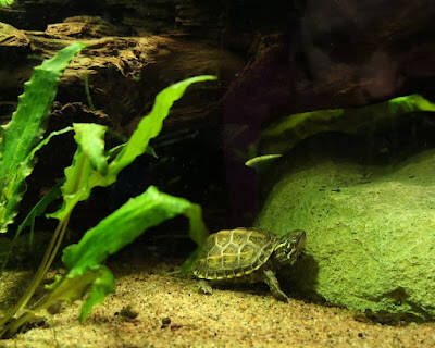 Først måtte jeg gjøre om på innredning, han trengte en landdel, og vannmengden måtte reduseres. Akvariet var jo allerede bebodd av fisk og snegler, men jeg tenkte de fikk prøve og leve side om side 🫣