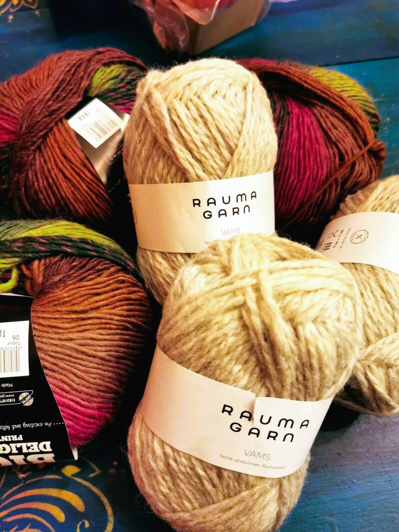 Den strikkes jo egentlig i tynnere garn i følge oppskriften, men jeg hadde dette fine Big Delight garnet fra Drops liggende, som jeg så for meg kunne bli fin i dette designet. Måtte jo også ha en grunnfarge, så valget falt på lys beige Vams fra Rauma.