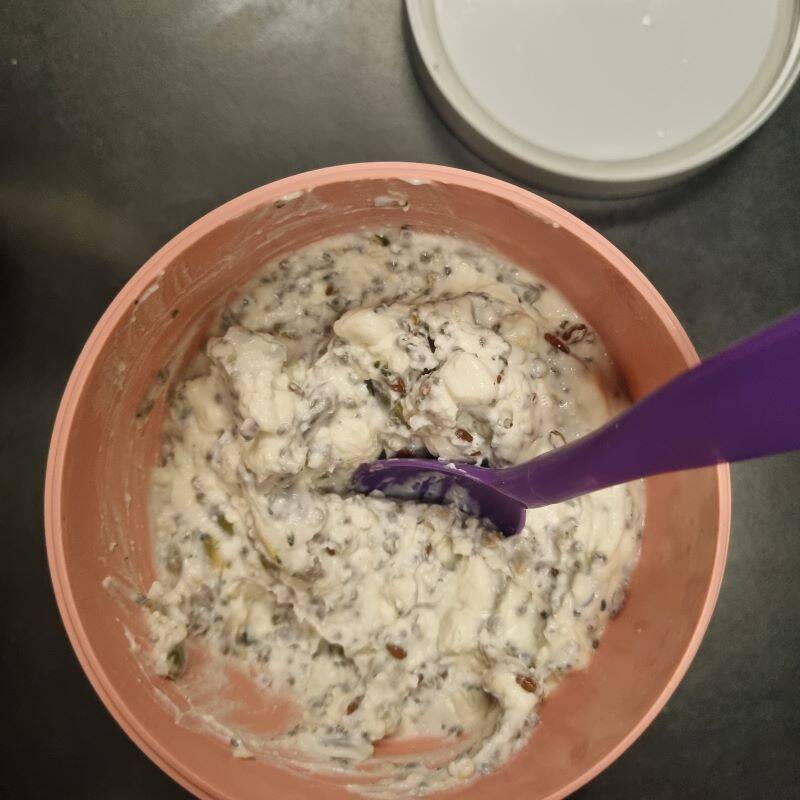 Jeg veier opp alle ingrediensene, og blander det godt sammen. Setter hele bollen i kjøleskapet over natta. Da har chiafrøene fått svellet ut, og binder det hele sammen.