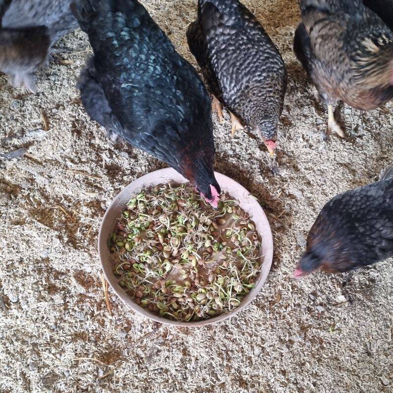 Mulig jeg må prøve meg på spiring av korn i steden, for damene var veeeldig skeptiske. Spirene ble nesten litt i overkant store, og høner har som kjent, ikke tenner 😅