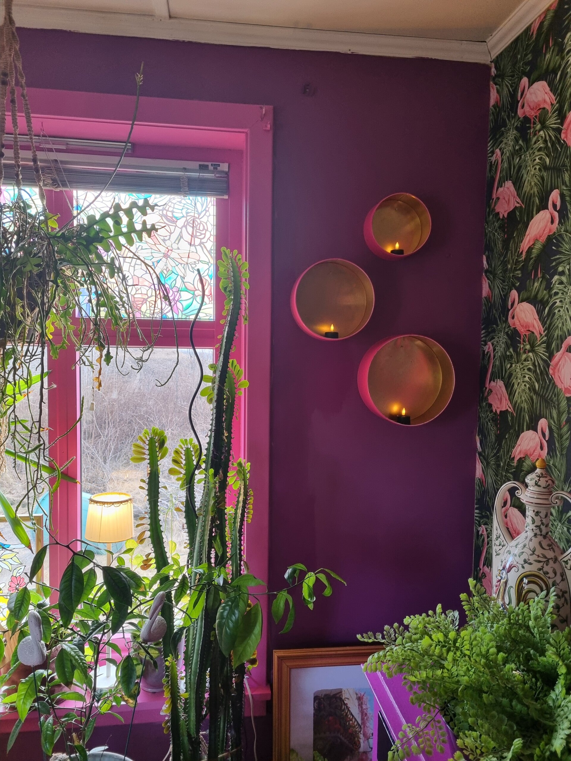 Vegglykter, laget av malte kakebokser.